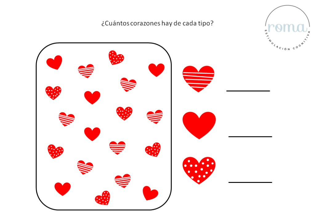 Además de las fichas que os dejé ayer para trabajar, os dejo la que estamos utilizando hoy. Se trata de contar cuántos corazones hay de cada tipo y poner el número junto a los corazones de la derecha.