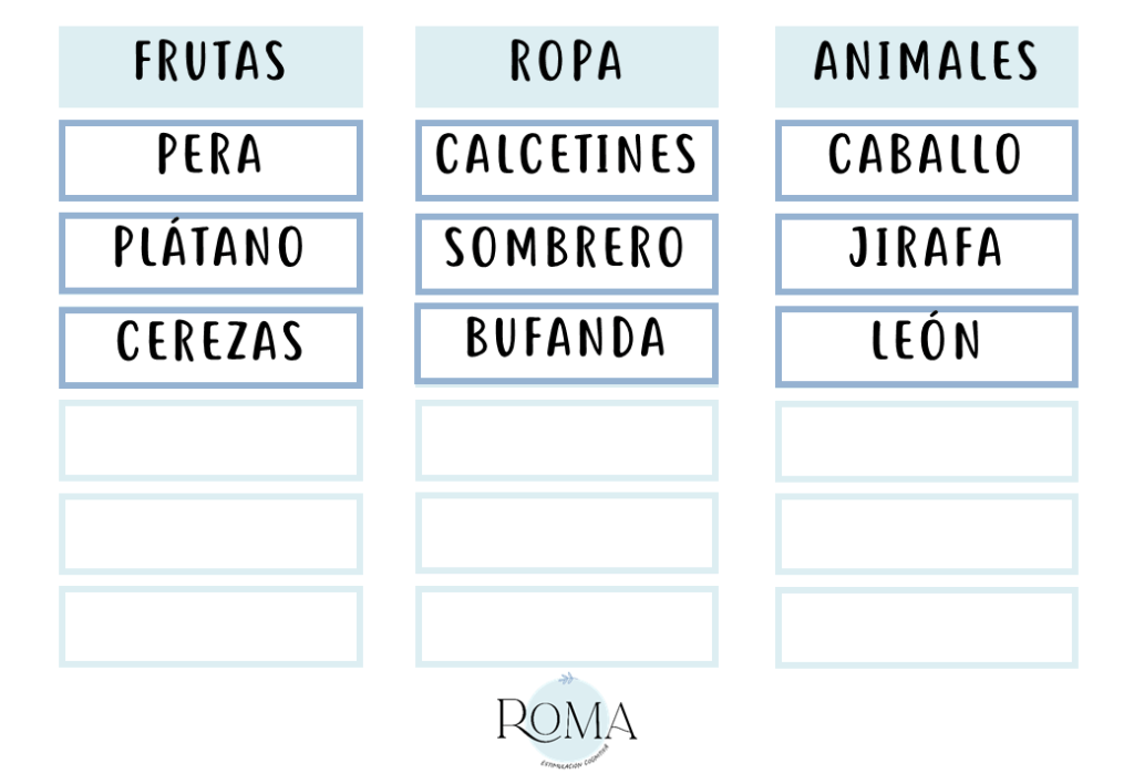 Además, cuando terminamos, añadimos dos palabras más de cada una de las categorías.
