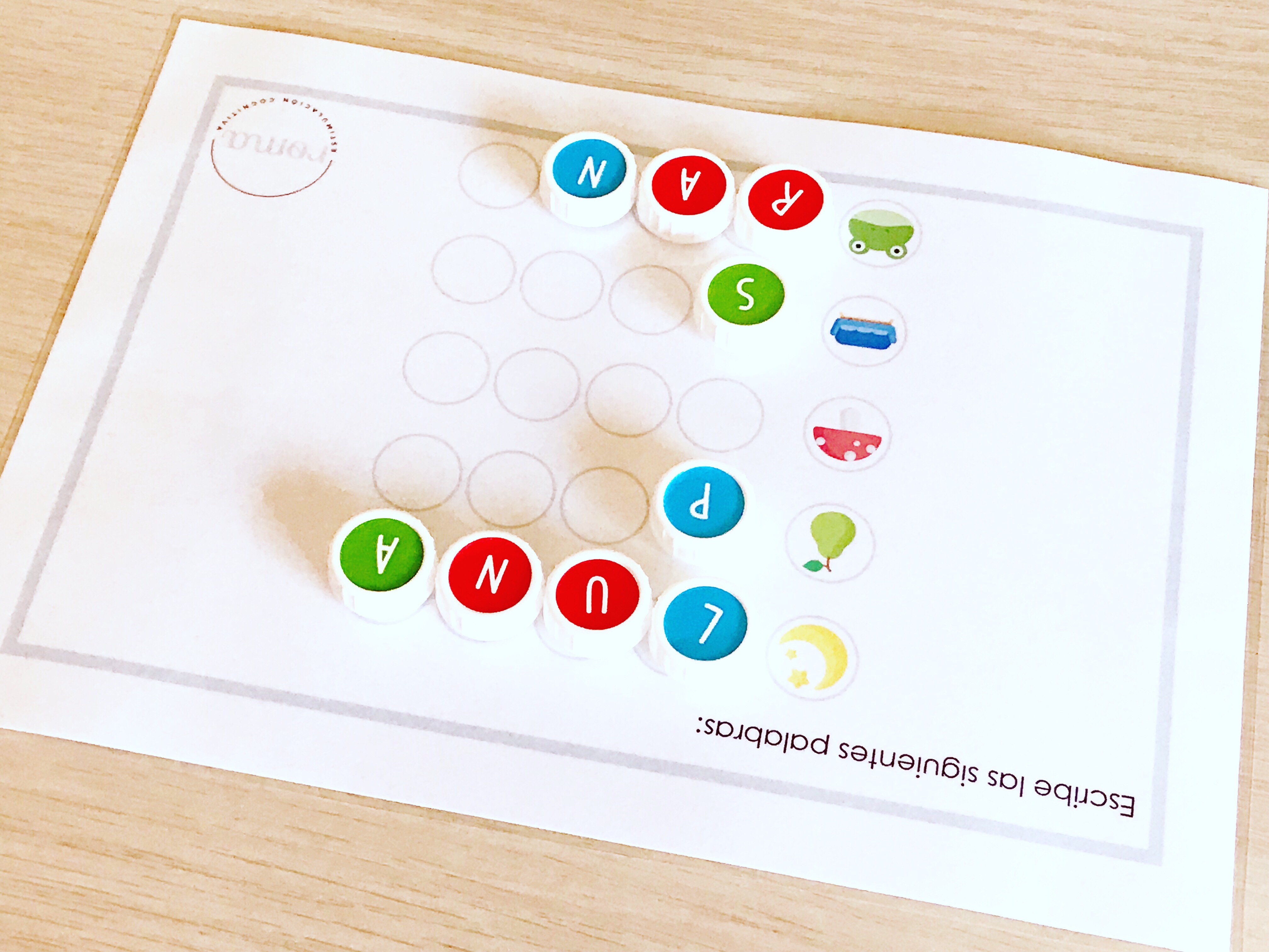 A partir de ahí, he creado unas fichas con dibujos en las que habrá que poner el nombre de cada uno con los tapones. Estas fichas las podréis descargar al final de este post.