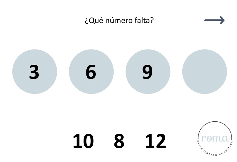 En este caso se trata de completar series numéricas, por lo que trabajaremos cálculo, atención, memoria y razonamiento entre otros.