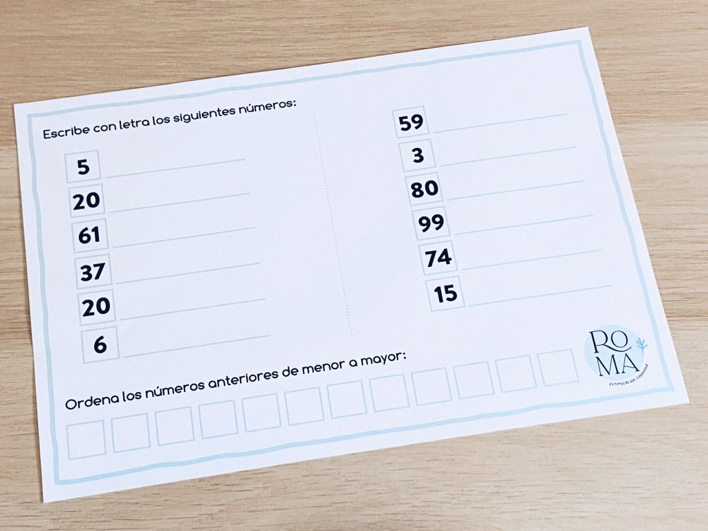 Consta de dos láminas con las que trabajaremos los números. En la primera lámina, se dan unos números y habrá que escribirlos con letra. Al final de la ficha, debemos ordenarlos de menor a mayor. Y en la segunda, habrá que escribir los números correspondientes (al contrario que en la primera) y de nuevo ordenarlos de menor a mayor.