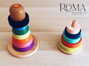 - RECONOCER FIGURAS Y APILARLAS. Esta actividad ya la hemos mencionado en el apartado anterior, ya que sensorialmente hay que reconocer las figuras geométricas y a la vez, trabajamos motricidad fina al apilarlas en los postes correspondientes.