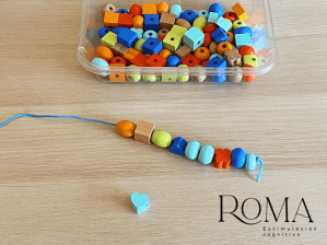 - ENSARTAR PIEZAS EN UN CORDÓN: este juego podemos encontrarlo en tiendas. Vienen bolas y piezas de diferentes formas y habrá que ir metiéndolas en el cordón. Podemos complicar un poco la actividad si deben seguir órdenes: «introduce una pieza redonda, ahora una cuadrada…».
