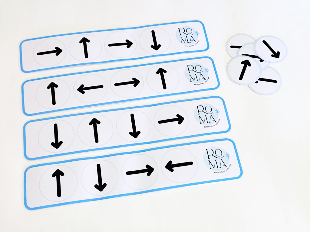 En las tarjetas en blanco deberán dibujar o pegar las flechas según el modelo a copiar. En el caso de trabajarlo con personas con mayor deterioro cognitivo, podemos pedir que pongan las flechas encima de la plantilla modelo, sin tener que trasladar la secuencia a otra tarjeta.