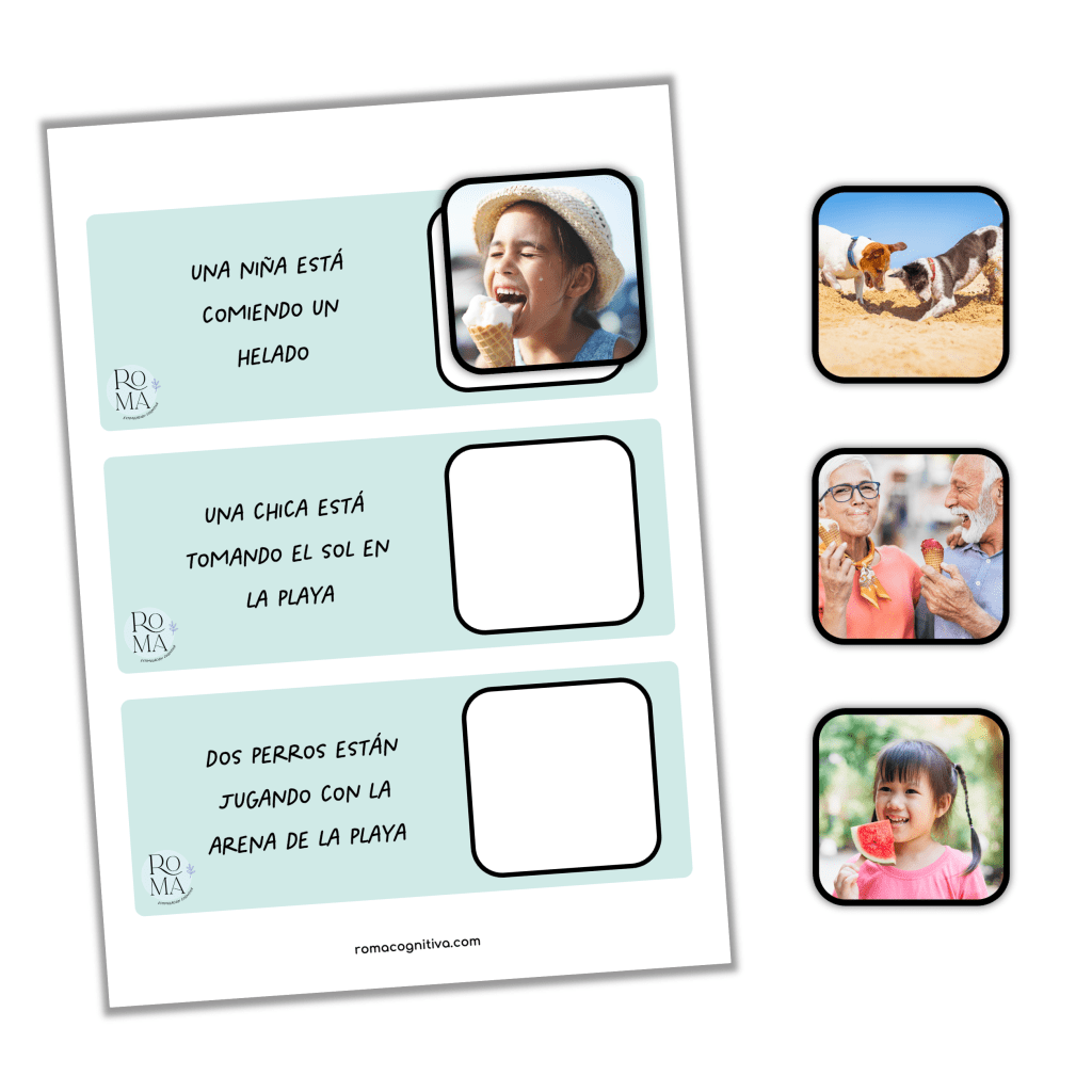 Este material es un cuadernillo con pequeños enunciados que hay que asociar a una imagen, relacionada con el verano.